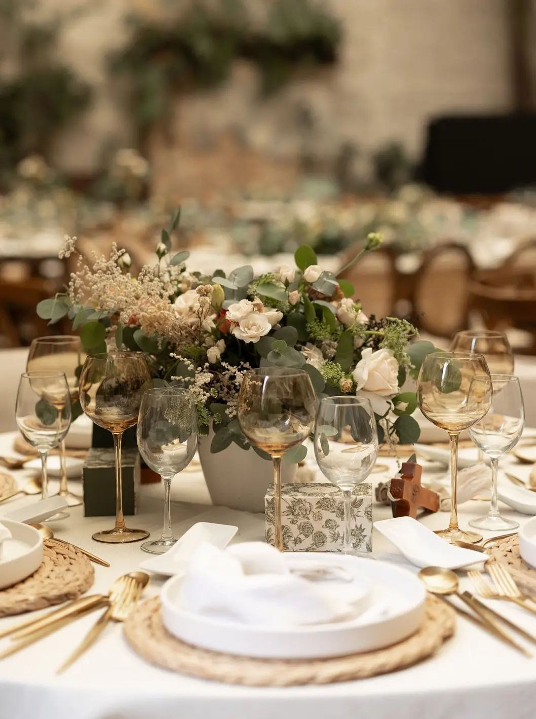 Un generoso bouquet bajo y redondo (rodete) que se convierte en el corazón floral de la mesa. Es un diseño clásico, compacto y rebosante de flores, que crea un punto focal de gran belleza sin interrumpir la vista entre los invitados. (Ideal para mesas redondas o cuadradas).