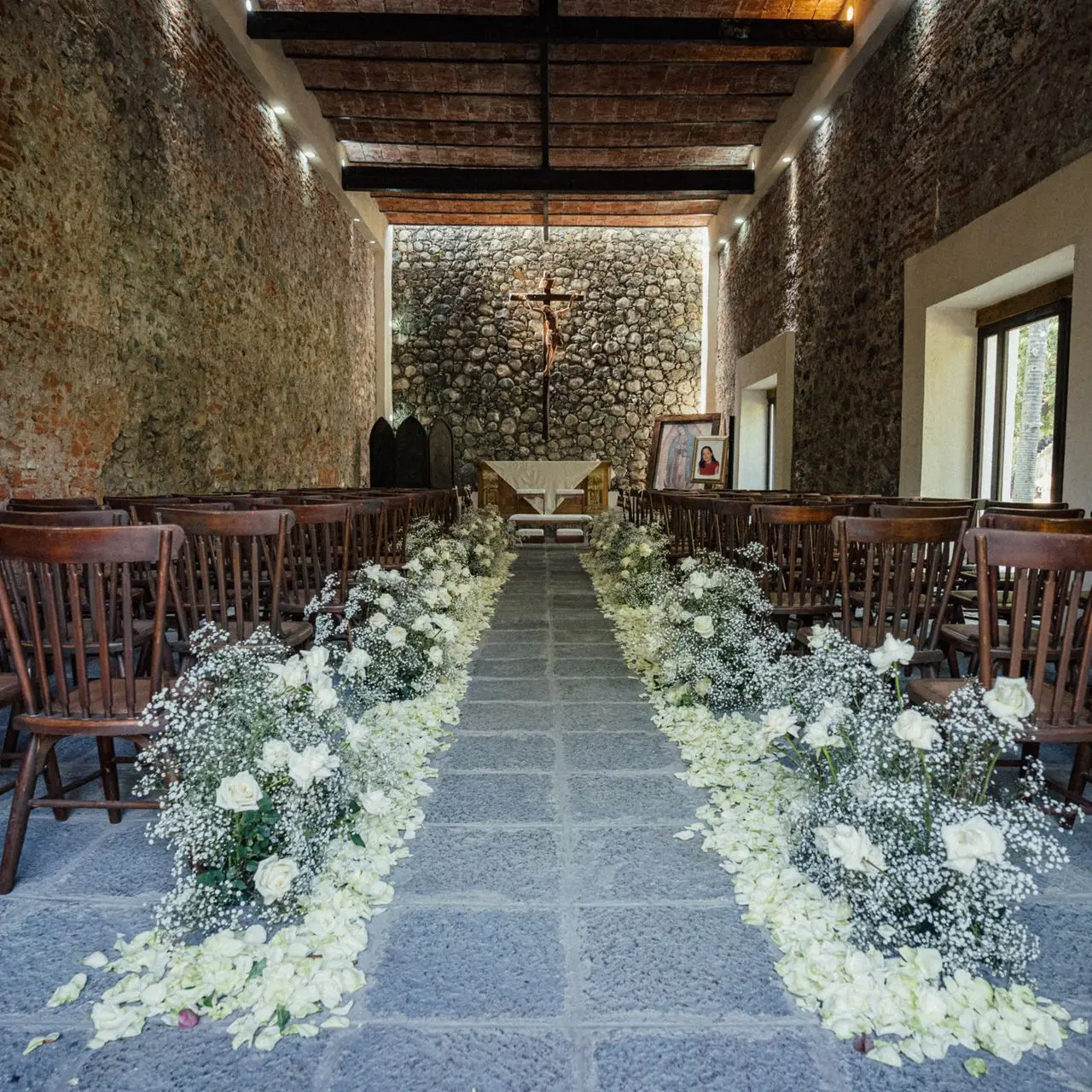 Un camino de pétalos te guía hacia un altar enmarcado con delicadeza. Es una declaración de amor atemporal y elegante.
