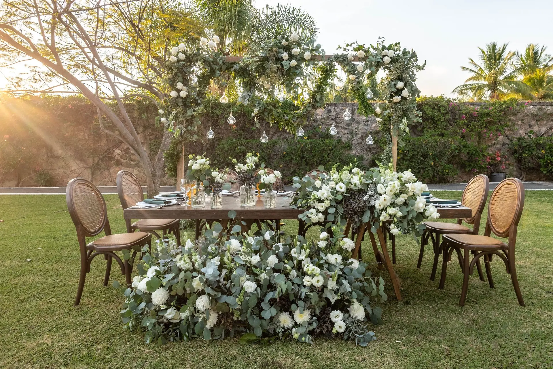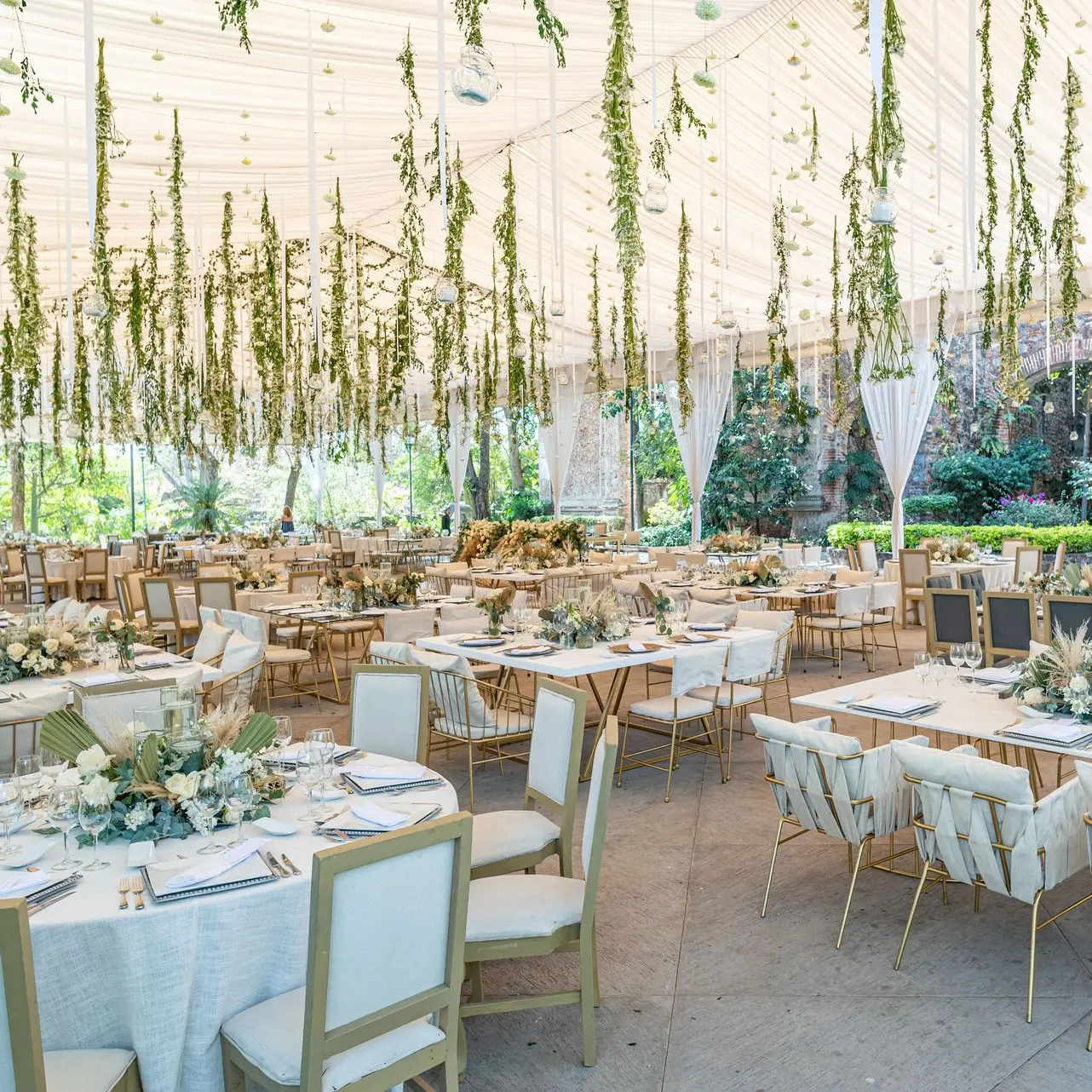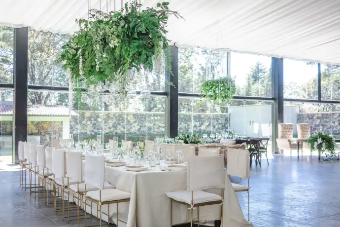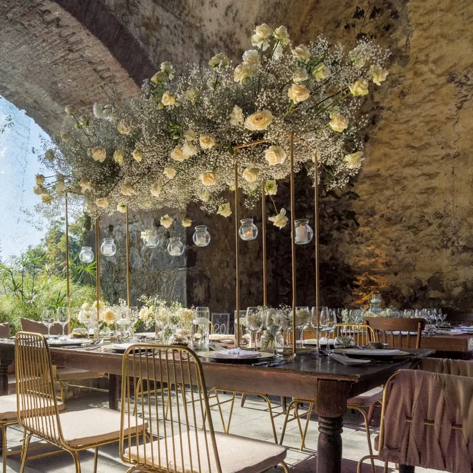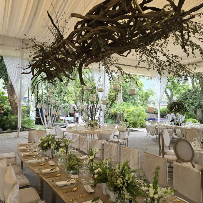 La máxima expresión de lujo y magia. Son arreglos aéreos que flotan sobre sus mesas, colgados directamente desde el techo o la carpa. Este diseño no solo libera por completo el espacio en la mesa para sus invitados, sino que transforma todo el ambiente en un jardín de ensueño, creando un efecto envolvente e inolvidable.