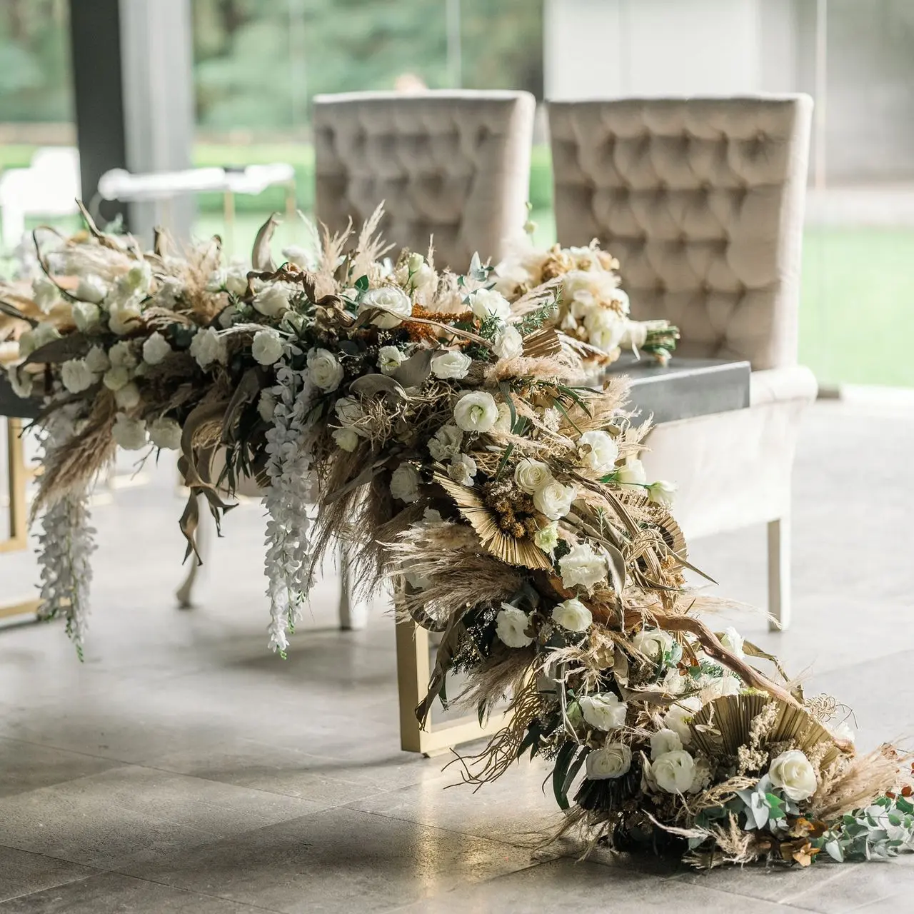 Una exquisita guirnalda de 80 cm que recorre la mesa, creando un efecto de jardín frondoso y orgánico. (Perfecto para mesas rectangulares).