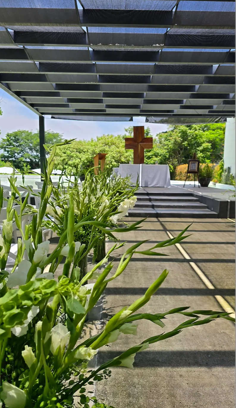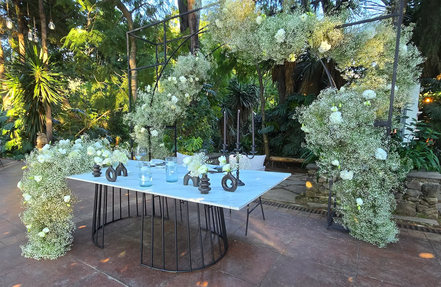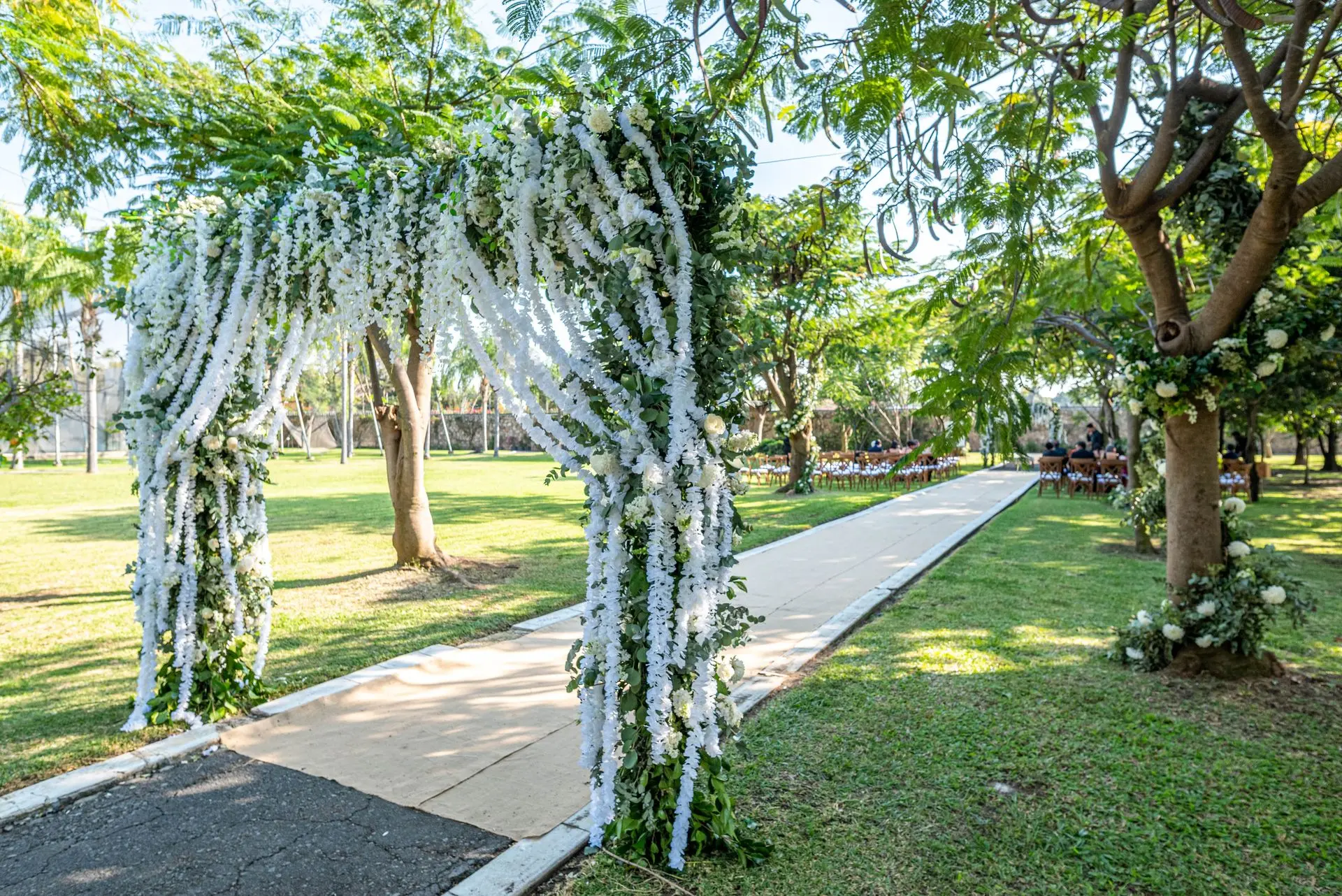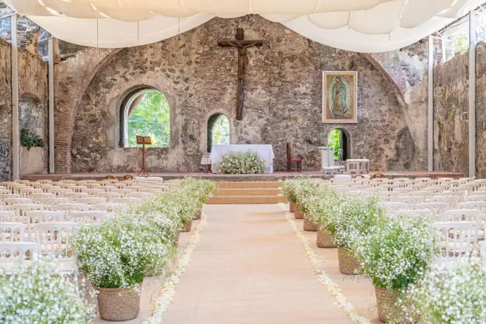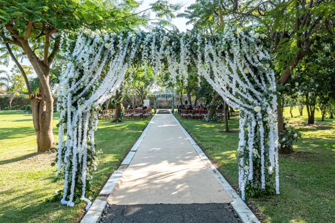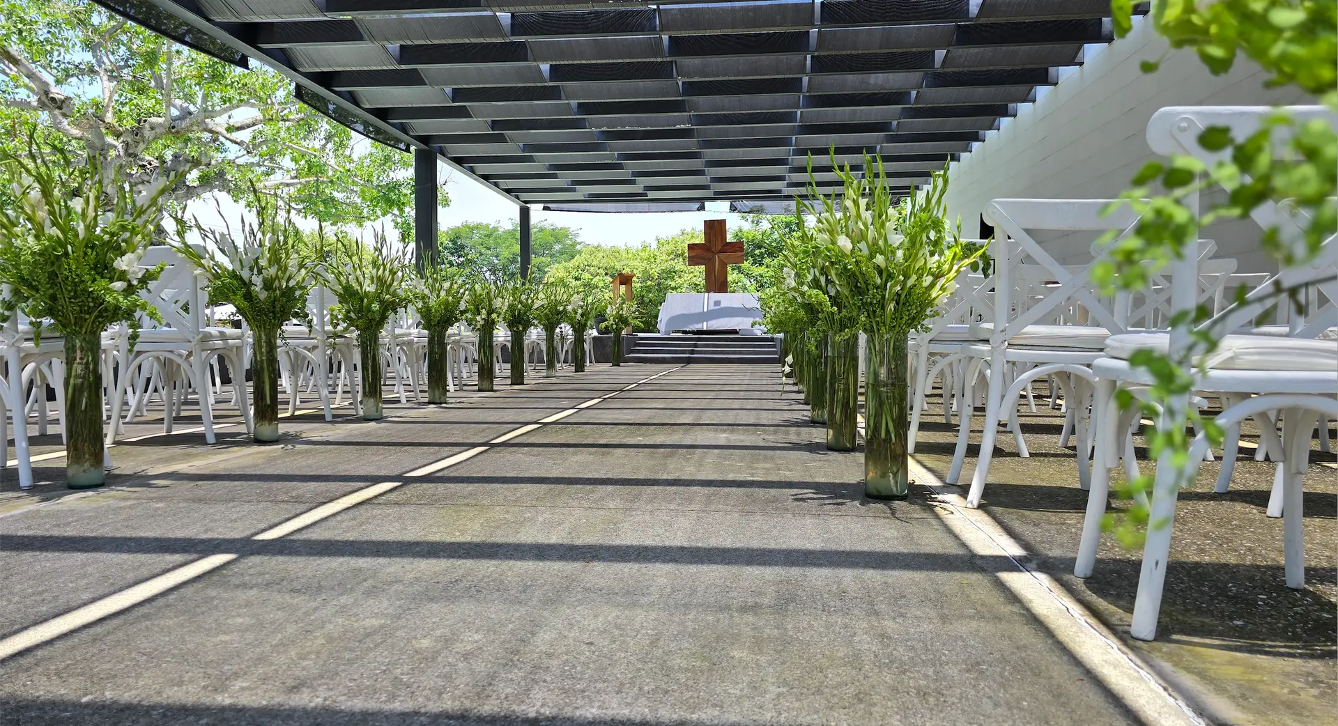La elegancia y el orden crean un pasillo de ensueño. Cada paso está flanqueado por belleza, culminando en un altar espectacular que se convierte en el corazón de la ceremonia.
