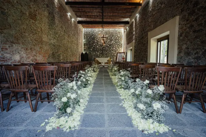 Pasillo: Laterales cubiertos de pétalos y 10 sutiles ramilletes marcando el camino.