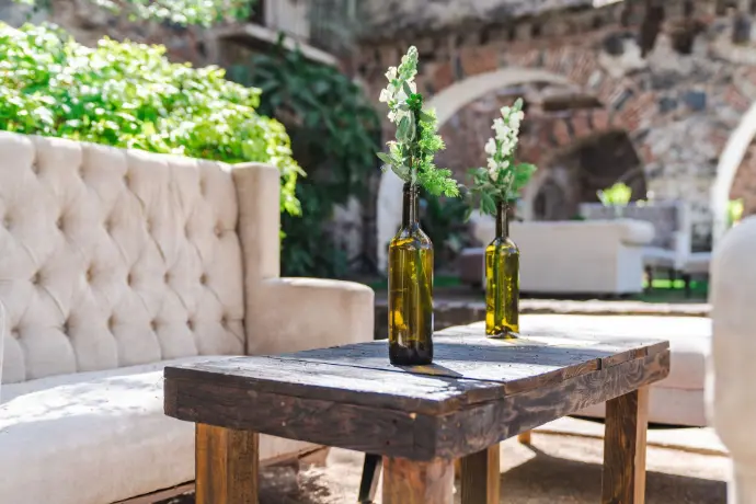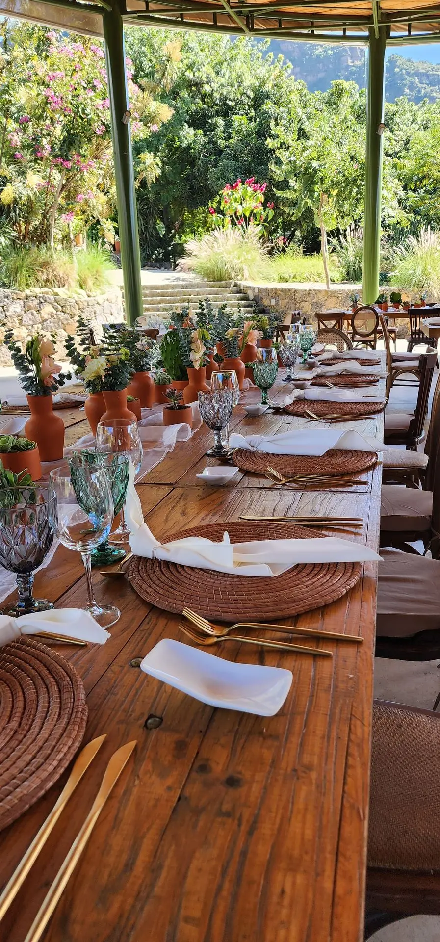 Grupos de floreros en cerámica o barro de distintos colores (11 por mesa), que aportan un toque artesanal, cálido y lleno de personalidad. (Adaptable a cualquier tipo de mesa).