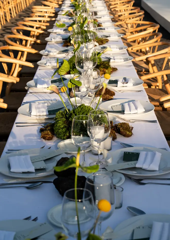 Un diseño moderno donde una jardinera de flores parece nacer a los pies de la mesa, mientras la superficie se decora con la luz cálida de las velas.