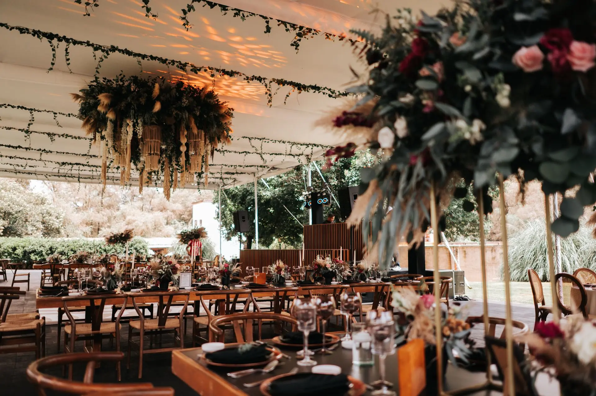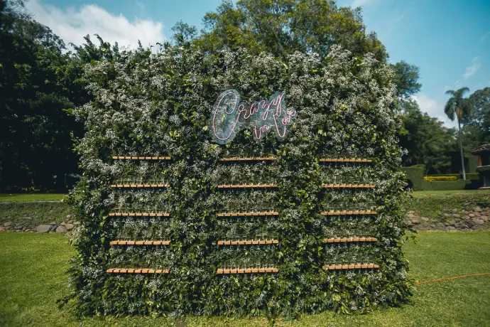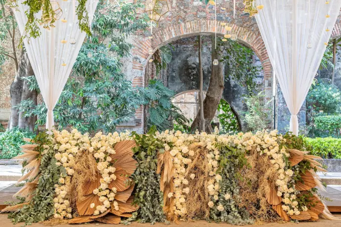 Una mampara o panel sólido cubierto de follaje y rematado con una guirnalda floral, creando un fondo vibrante y sofisticado