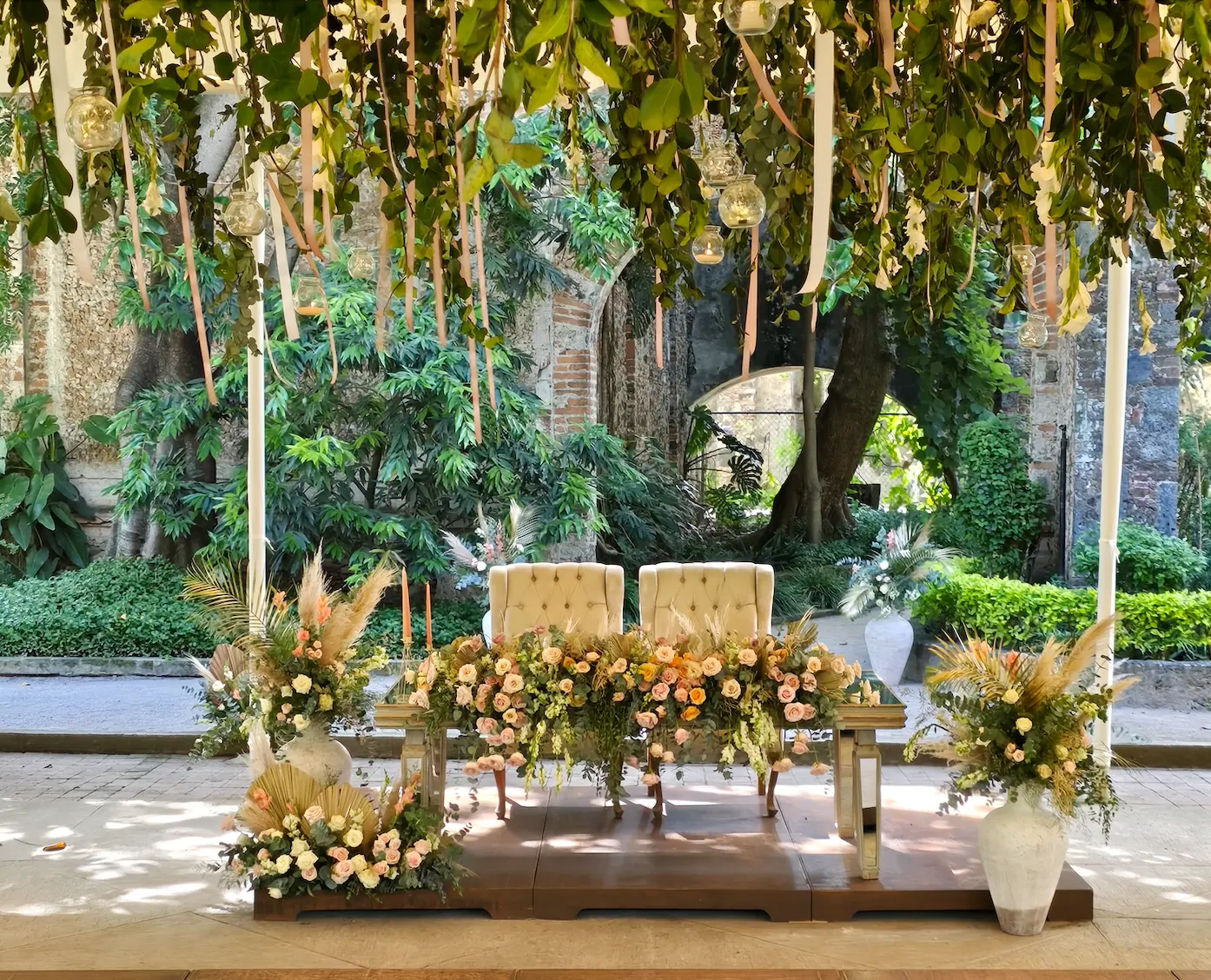 Altar: Una guirnalda frondosa o dos arreglos altos imponentes para enmarcar el "sí, acepto"