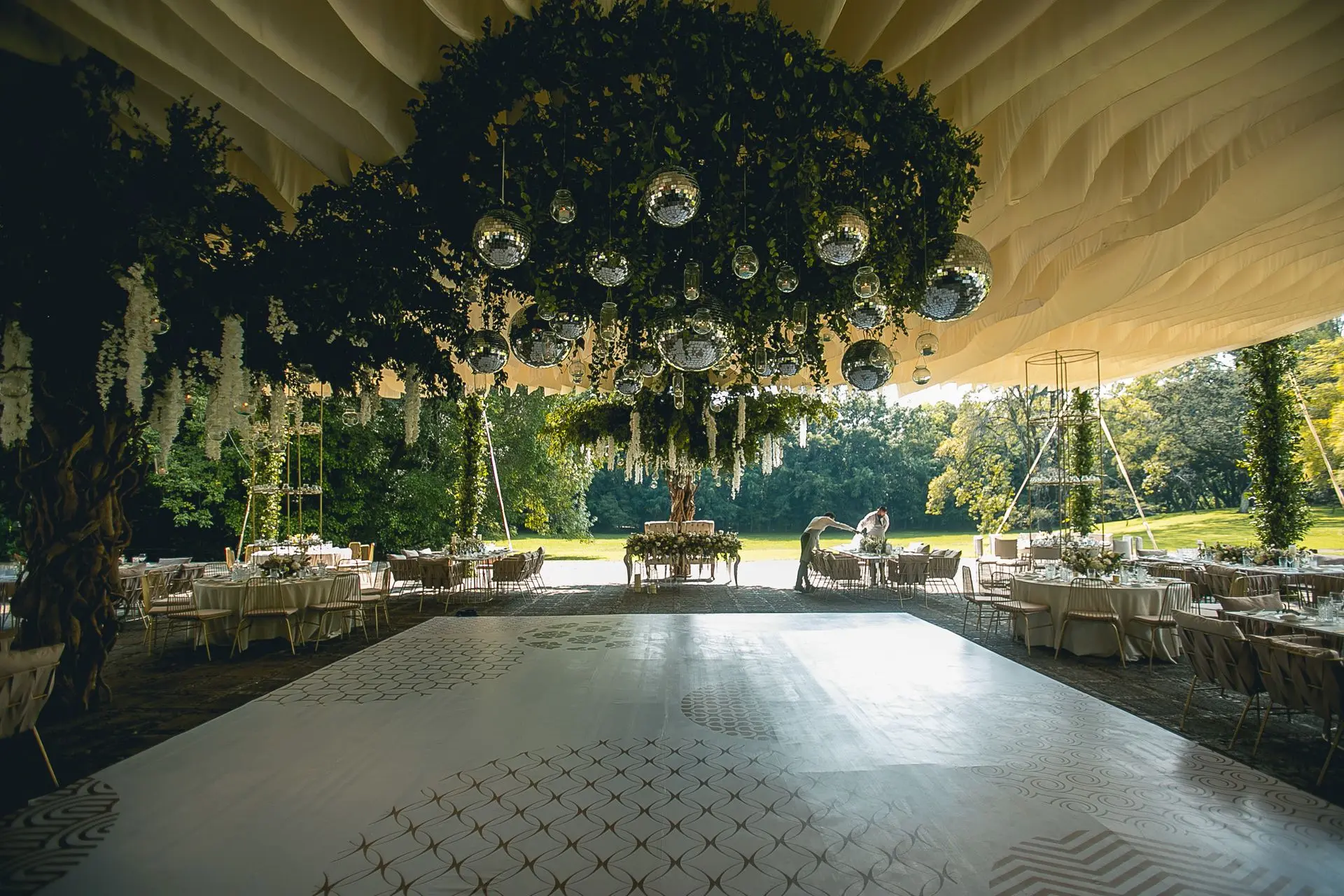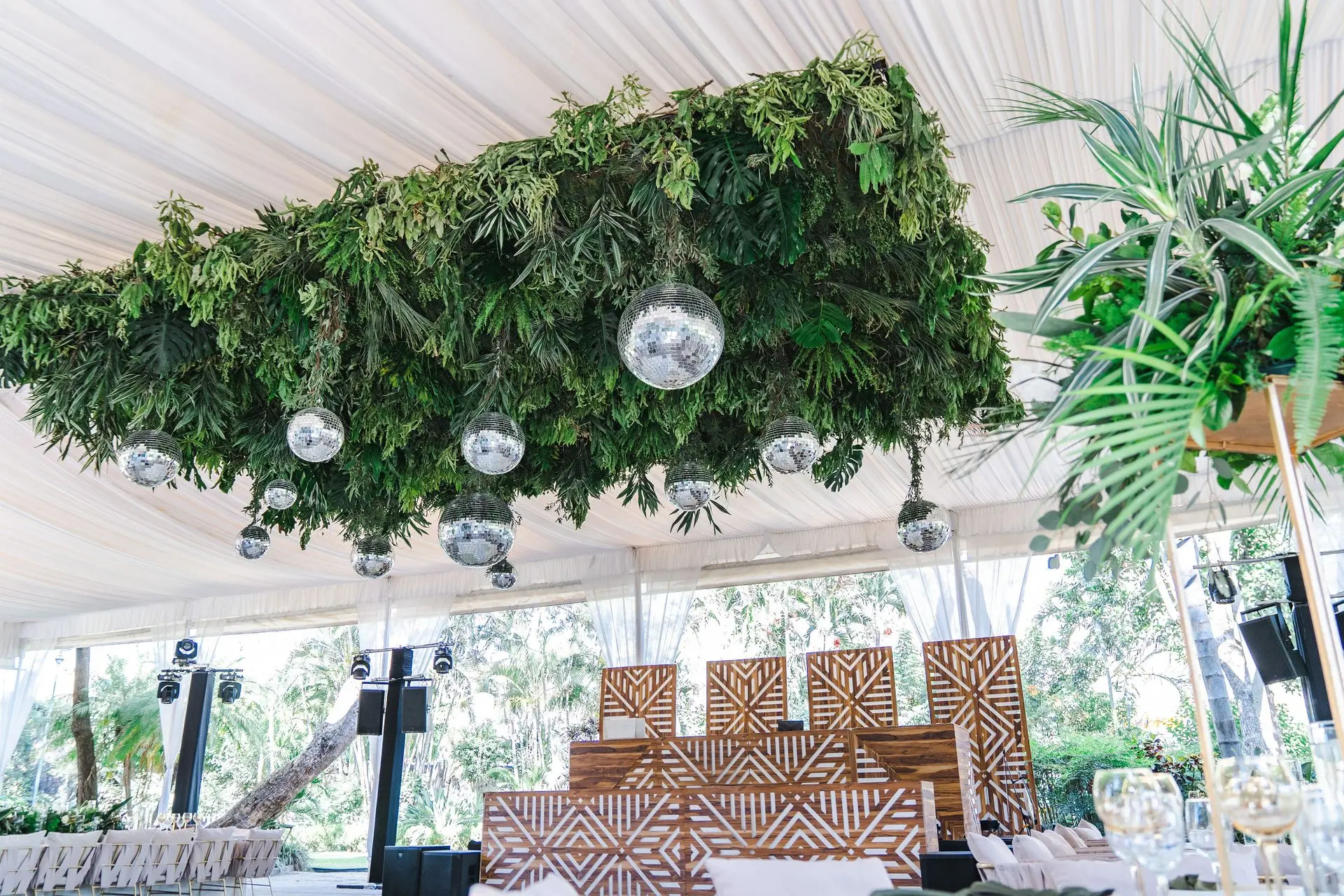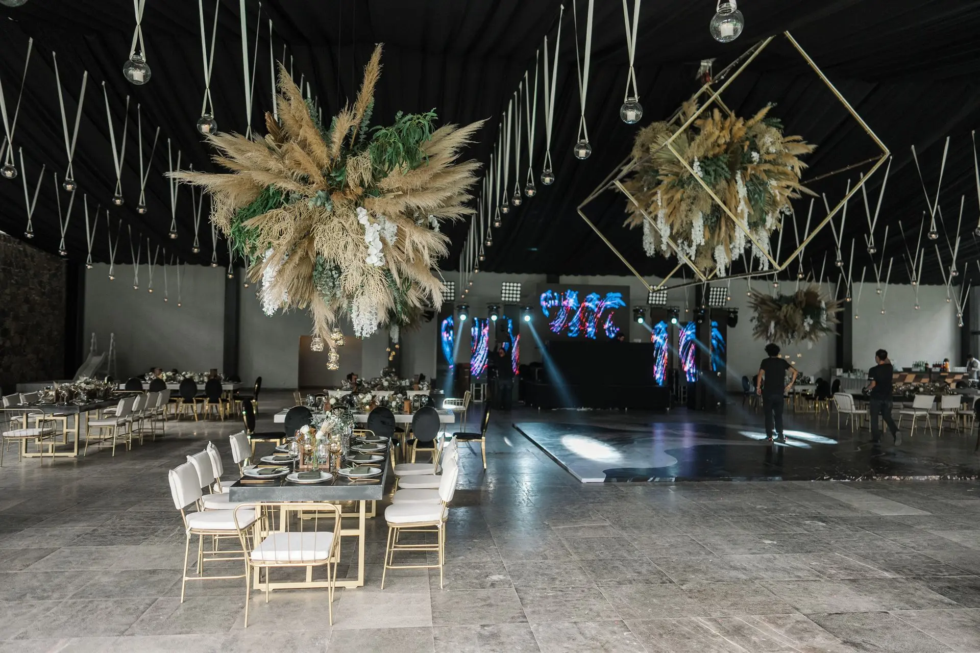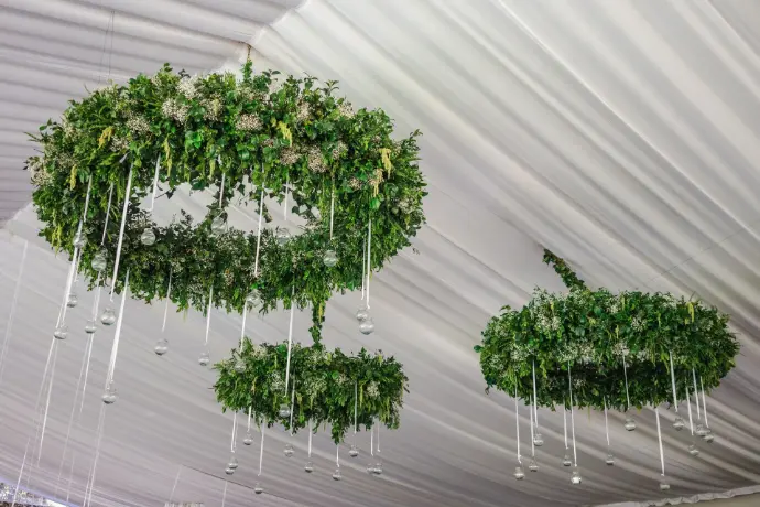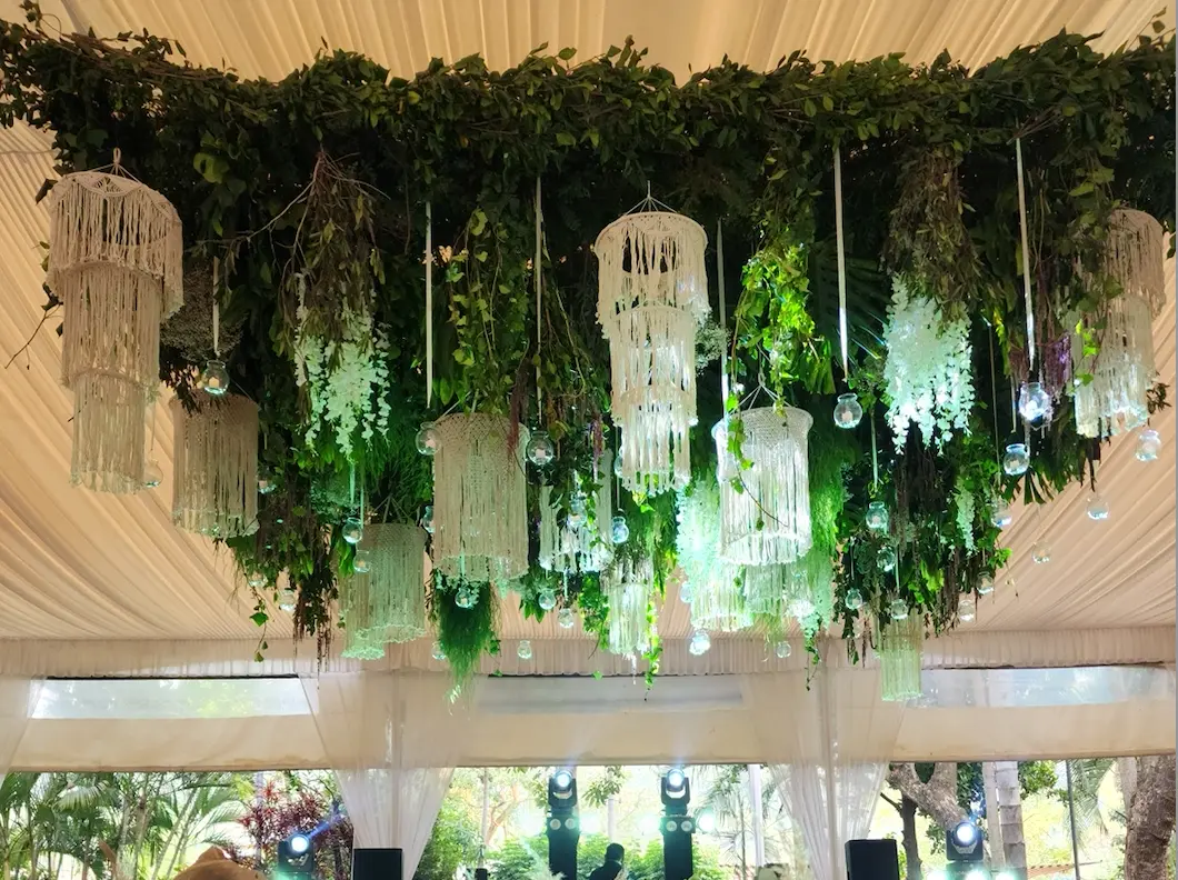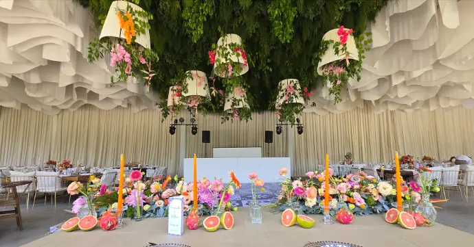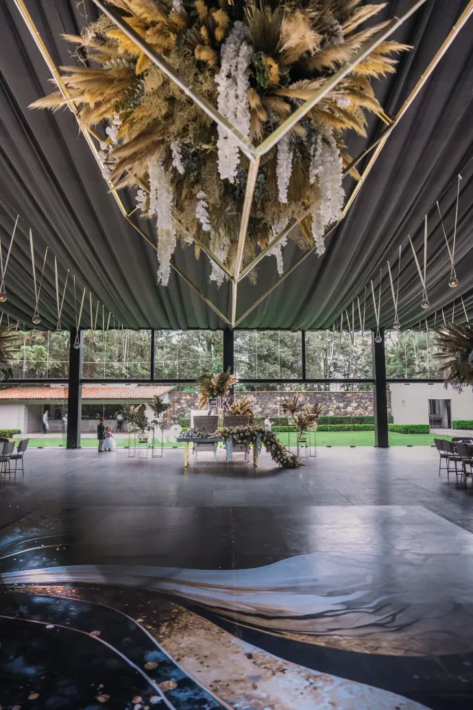 ¿Quieren un verdadero efecto "wow"? Llevamos el diseño al siguiente nivel con instalaciones que flotan sobre sus invitados, transformando el techo de su evento en un espectáculo inolvidable, especialmente sobre la pista de baile.