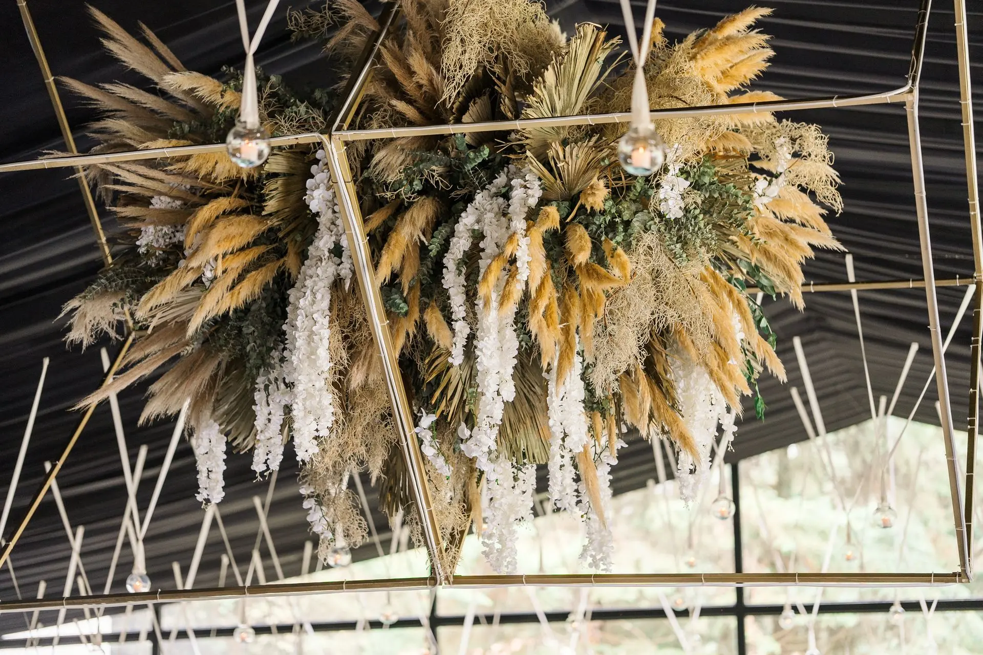 Un diseño impactante que combina 16 lámparas o pantallas de macramé con 8 grandes bolas de follaje o flores secas, creando un ambiente bohemio de gran lujo.